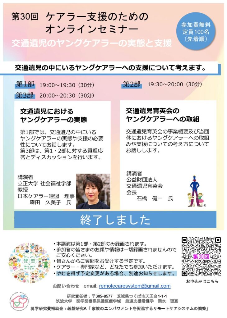 本イベントは終了いたしました。 アーカイブ配信をご視聴くださ … 続きを読む 【第30回】交通遺児の中にいるヤングケアラーへの支援について考えます。